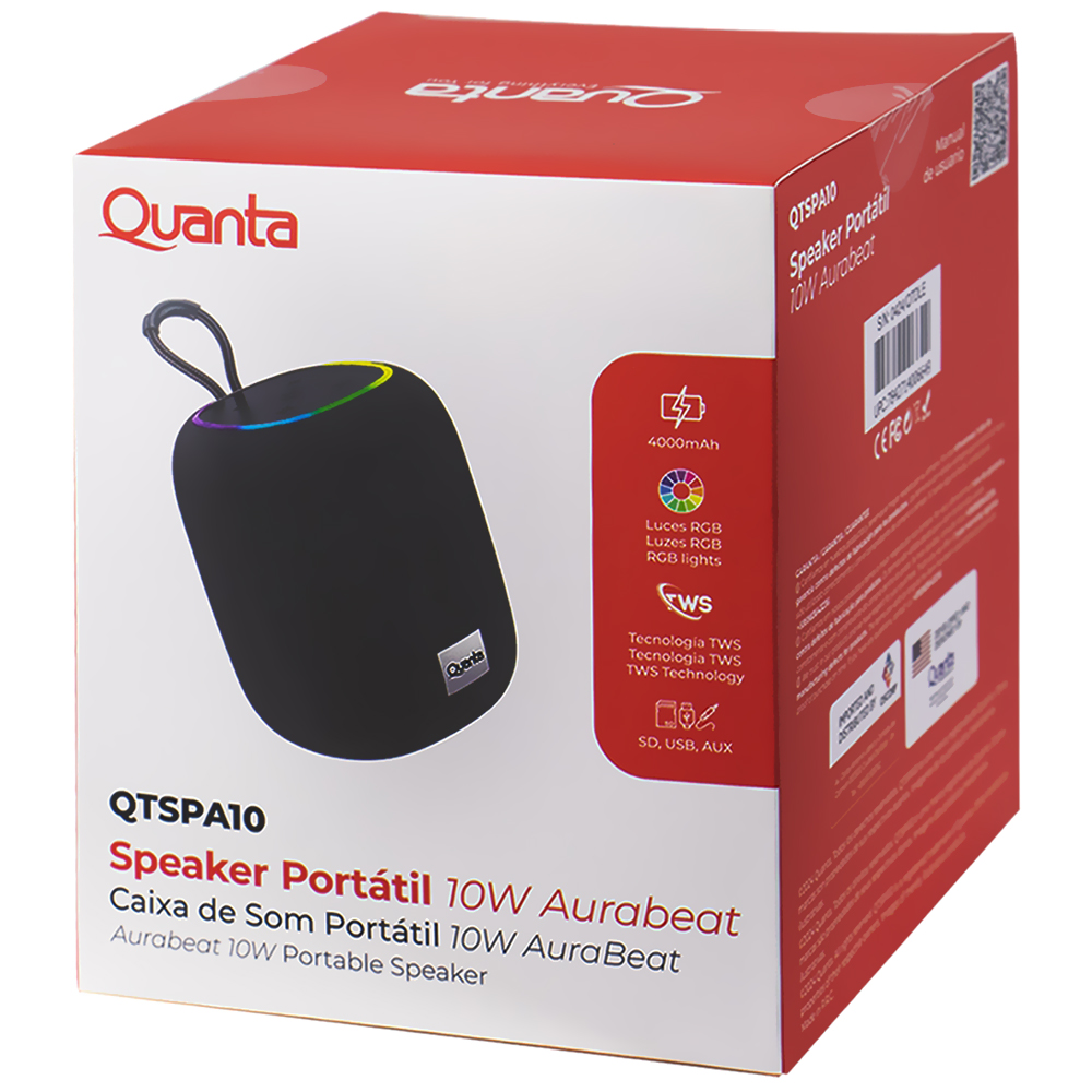 O speaker Quanta QTSPA10 é o speaker portátil que combina elegância, potência e versatilidade em um único dispositivo. Graças aos 10 W de som nítido e potente, cada nota e batida são reproduzidas com clareza excepcional, proporcionando uma experiência auditiva envolvente, não importa onde você esteja. Seu design compacto e leve facilita o transporte para qualquer lugar, enquanto a iluminação RGB acrescenta um toque de ambiente que se sincroniza com a batida da sua música.