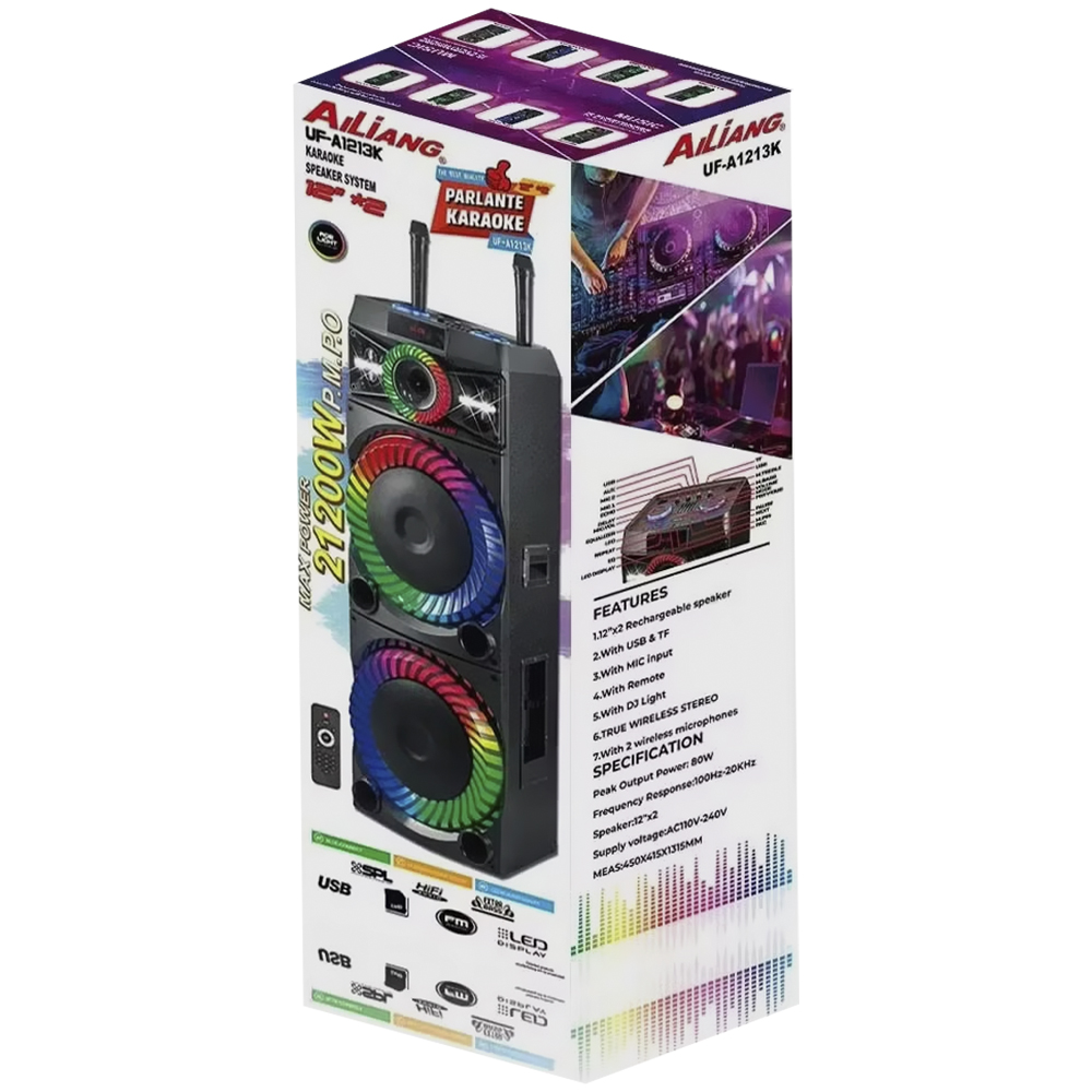SPEAKER AILIANG UF-A1213K 12" LED BT/AUX/USB/FM/TF/MIC RECARREGAVEL BIVOLT PRETO | AILIANG | Visãovip Informática