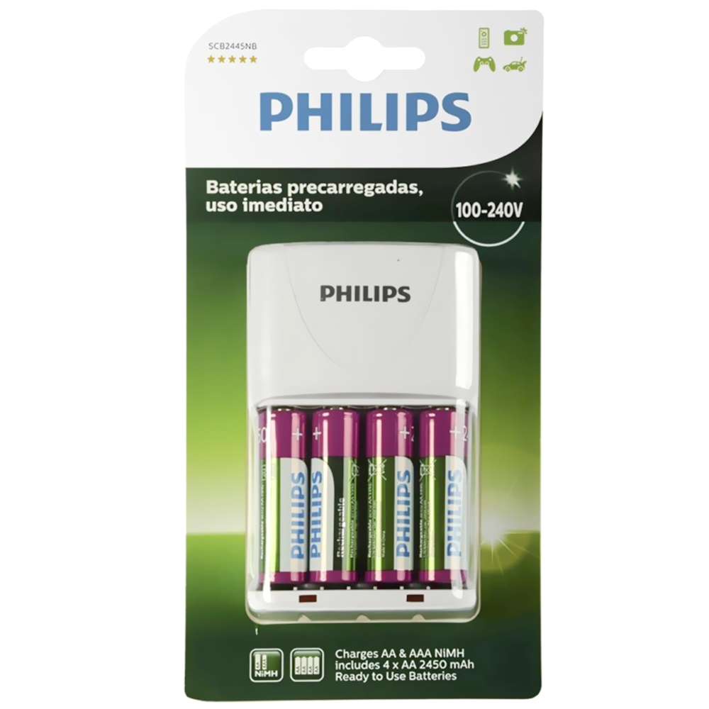 Descubra o futuro do carregamento inteligente por meio do carregador Philips SCB2445NB, seu parceiro definitivo para manter todas as pilhas recarregáveis em ótimas condições e prontas para a ação. Esse dispositivo de última geração foi projetado para proporcionar uma experiência sem complicações, permitindo que você recarregue pilhas AA e AAA graças à sua voltagem universal, que garante compatibilidade perfeita com pilhas de várias marcas e modelos.
