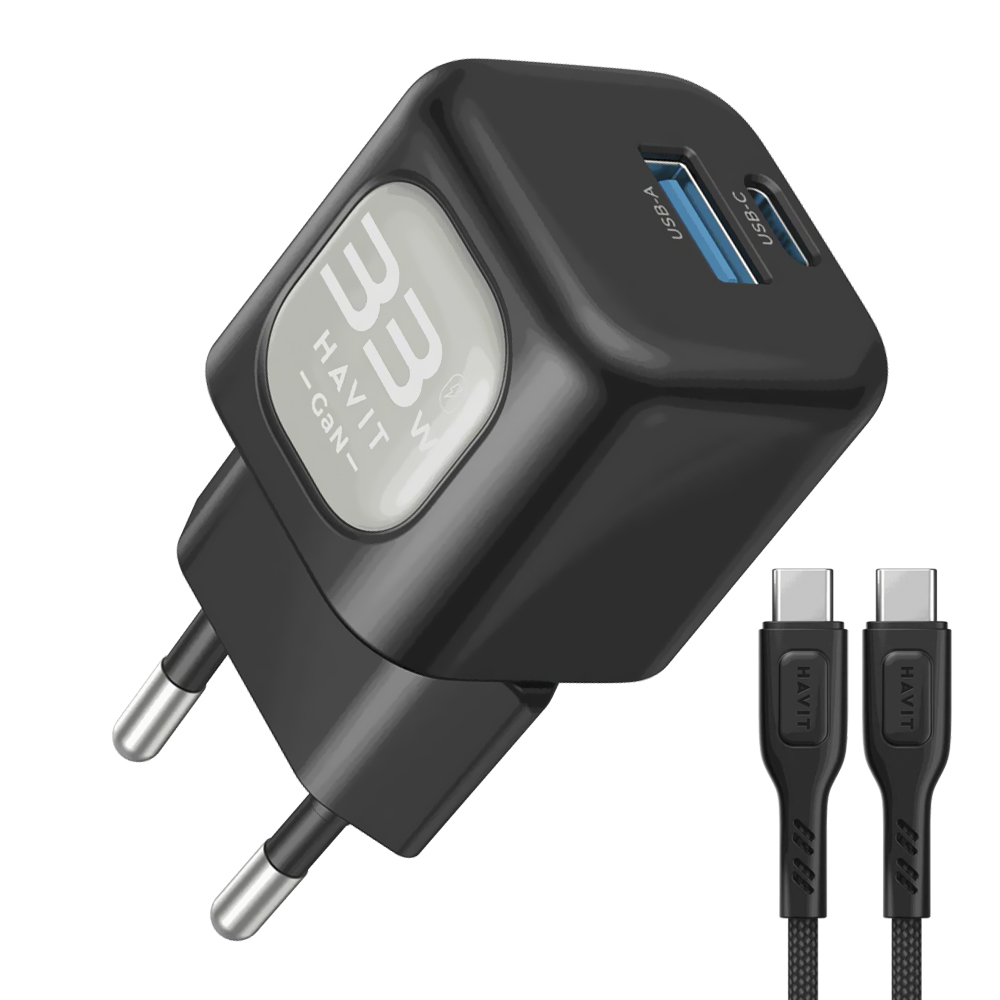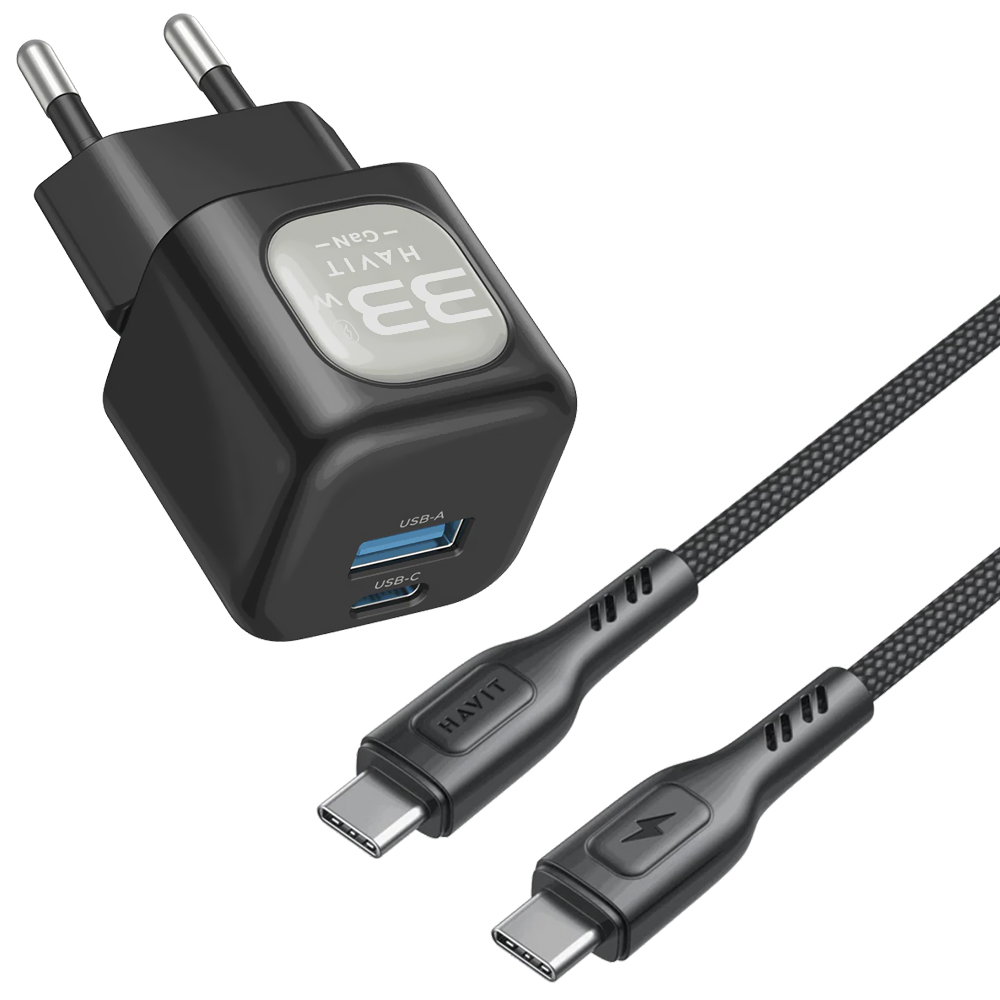 Carregador Tomada Havit UC233 USB / USB-C / 33W - Preto + Cabo USB-C / USB-C