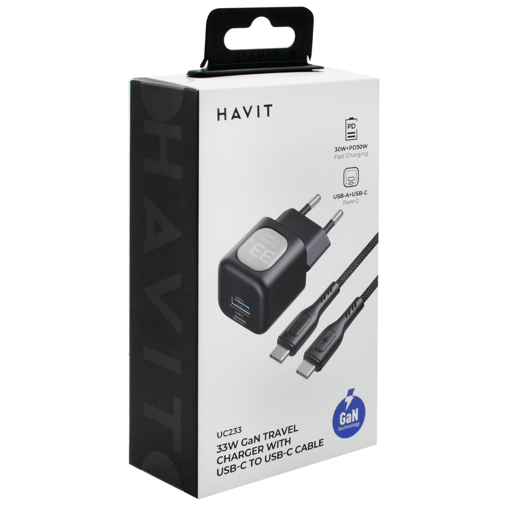 Carregador Tomada Havit UC233 USB / USB-C / 33W - Preto + Cabo USB-C / USB-C | HAVIT | Visão Vip Informática