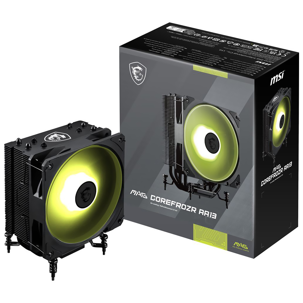 Ideal para processadores exigentes, o MSI MAG COREFROZR AA13 oferece refrigeração eficiente em design compacto. Seus quatro heat pipes de cobre de 6 mm com contato direto e 50 aletas de alumínio dissipam até 240W TDP. A ventoinha de 120 mm atinge até 2070 RPM, movendo 62.6 CFM de ar com um máximo de 34.1 dBA de ruído. Iluminação ARGB. Compatível com Intel LGA 1851/1700 e AMD AM5/AM4. Inclui pasta térmica pré-aplicada e montagem simples. Refrigeração potente, silenciosa e com estilo.