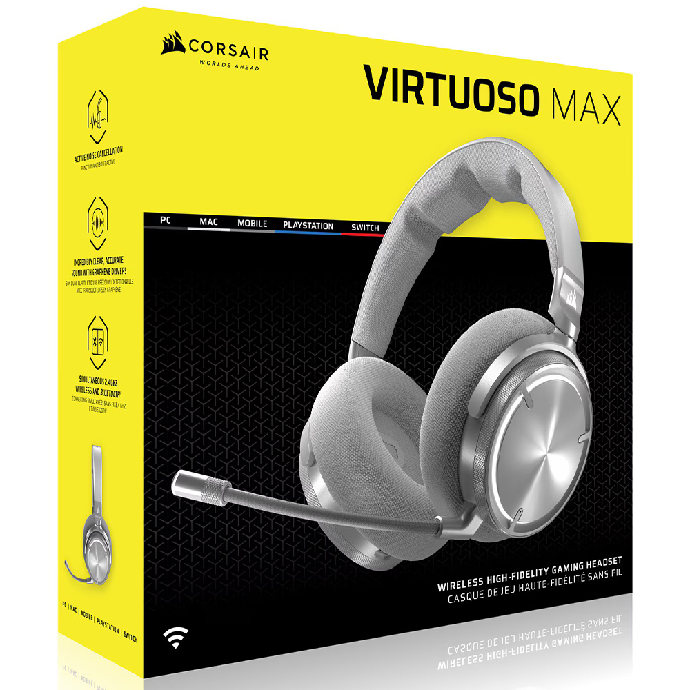 O acabamento em prata do Corsair Virtuoso Max define uma estética superior que se complementa com um som envolvente Dolby Atmos de 40 kHz. Este headset sem fio transforma cada partida em uma experiência imersiva graças ao cancelamento de ruído ativo e almofadas em viscoelástico que garantem conforto total. Com 60 horas de bateria e conectividade dual para PC, PS5 ou celulares, é a peça definitiva para quem busca exclusividade e potência sonora em um único dispositivo premium.