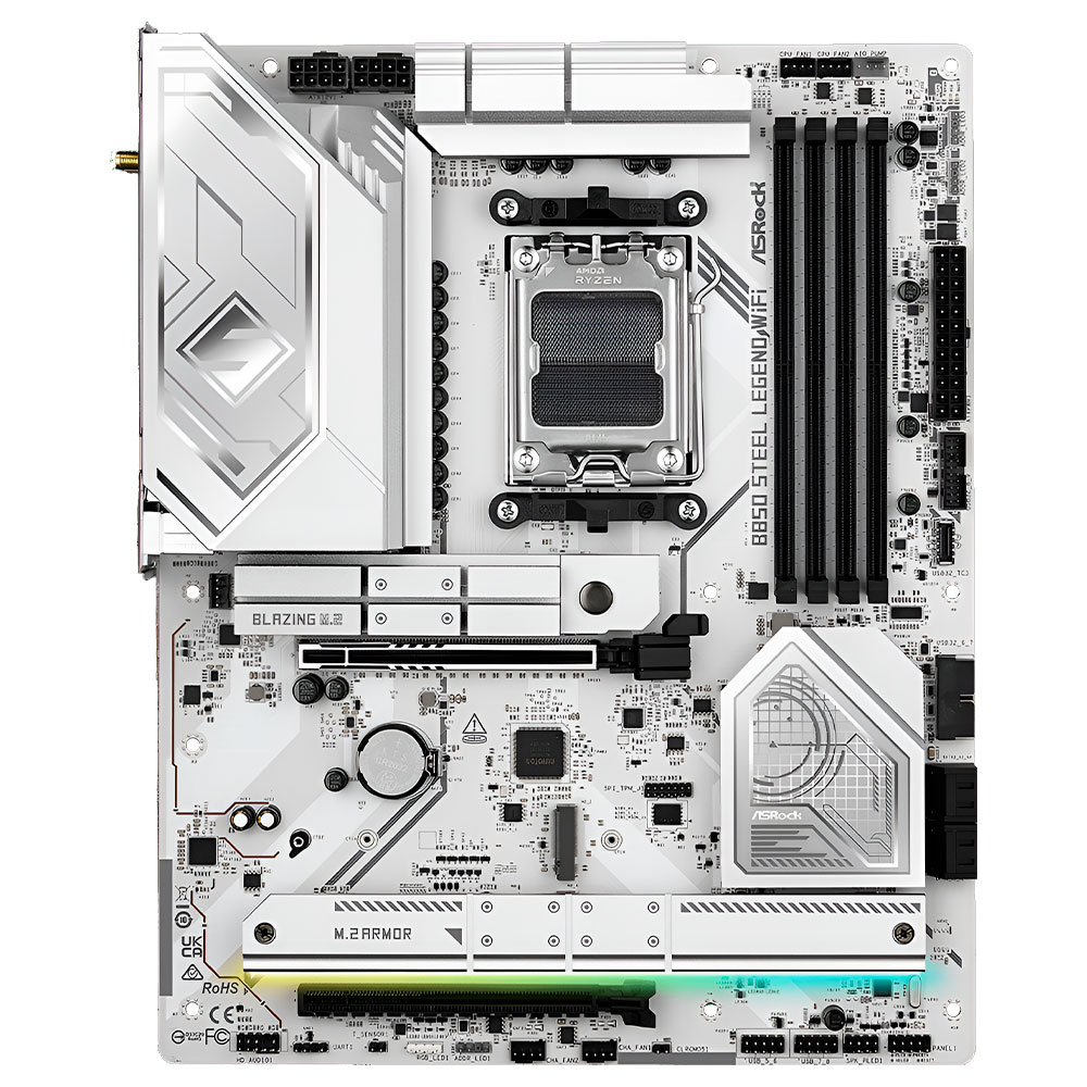 A placa-mãe ASRock B850 Steel Legend Wi-Fi não só se destaca por seu desempenho, mas também por sua estética robusta e sofisticada. Essa motherboard é compatível com os processadores das séries Ryzen 9000, 8000 e 7000, oferecendo a potência e a eficiência para levar sua experiência de computação a um novo patamar. No formato ATX, ela combina durabilidade e estilo. Fabricada com materiais de alta qualidade, ela garante um rendimento consistente e confiável, mesmo nas condições mais exigentes.