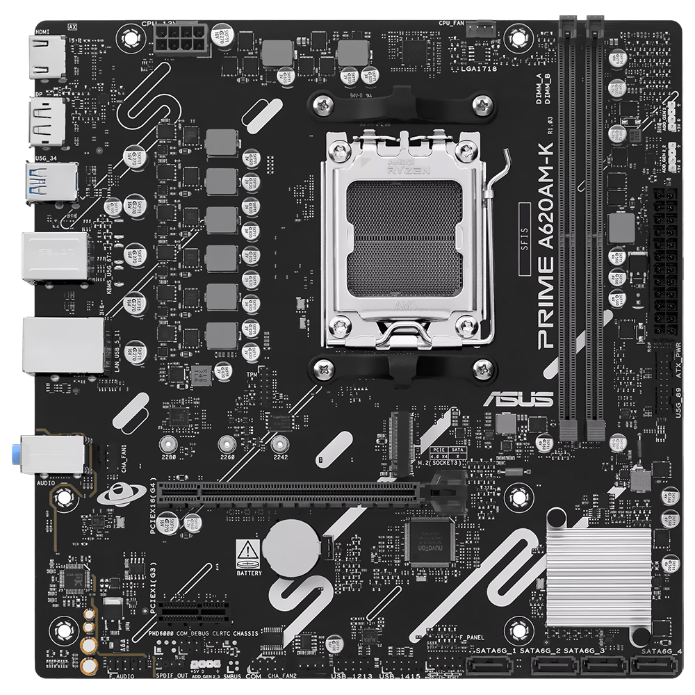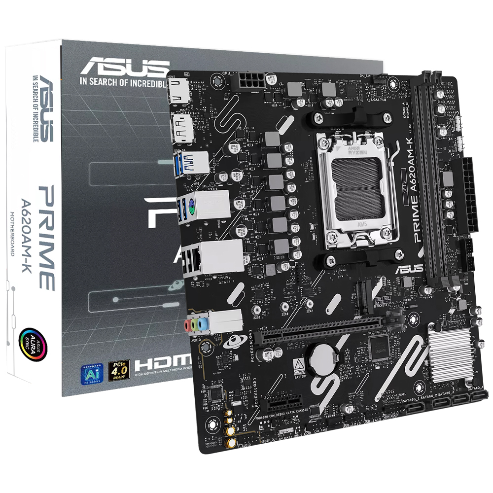 ASUS Prime A620AM-K é uma placa-mãe Micro ATX desenvolvida para extrair o máximo desempenho dos processadores AMD Ryzen Socket AM5. Seu design compacto e resistente, com dissipadores estratégicos, garante resfriamento confiável e durabilidade. Suporta até 128 GB de memória DDR5 em dual channel, oferecendo performance estável e rápida em jogos e aplicações profissionais, ideal para PCs modernos e setups eficientes.