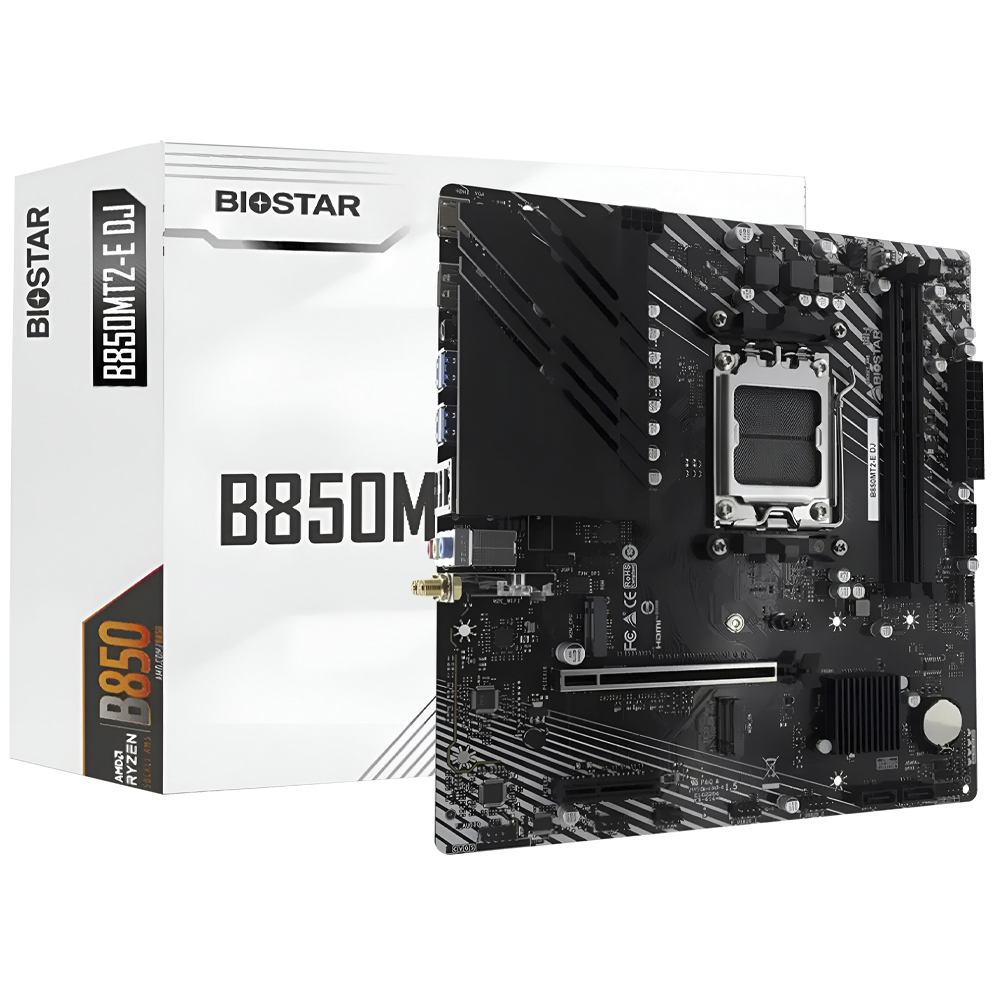 A Biostar B850MT2-E DJ é uma placa-mãe Micro ATX que combina potência, eficiência e praticidade em um design compacto e versátil. É ideal para quem procura um equipamento moderno e equilibrado, capaz de oferecer grande desempenho sem ocupar muito espaço. Equipada com soquete AM5 e chipset B850, é compatível com os processadores AMD Ryzen 9000, 8000 e 7000. Seu suporte para memória DDR5 de até 128 GB a 8000 MHz garante fluidez em multitarefas, jogos e aplicativos profissionais.