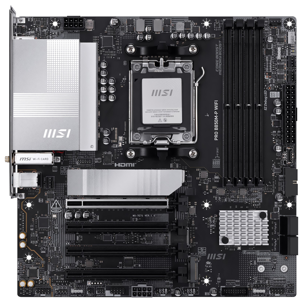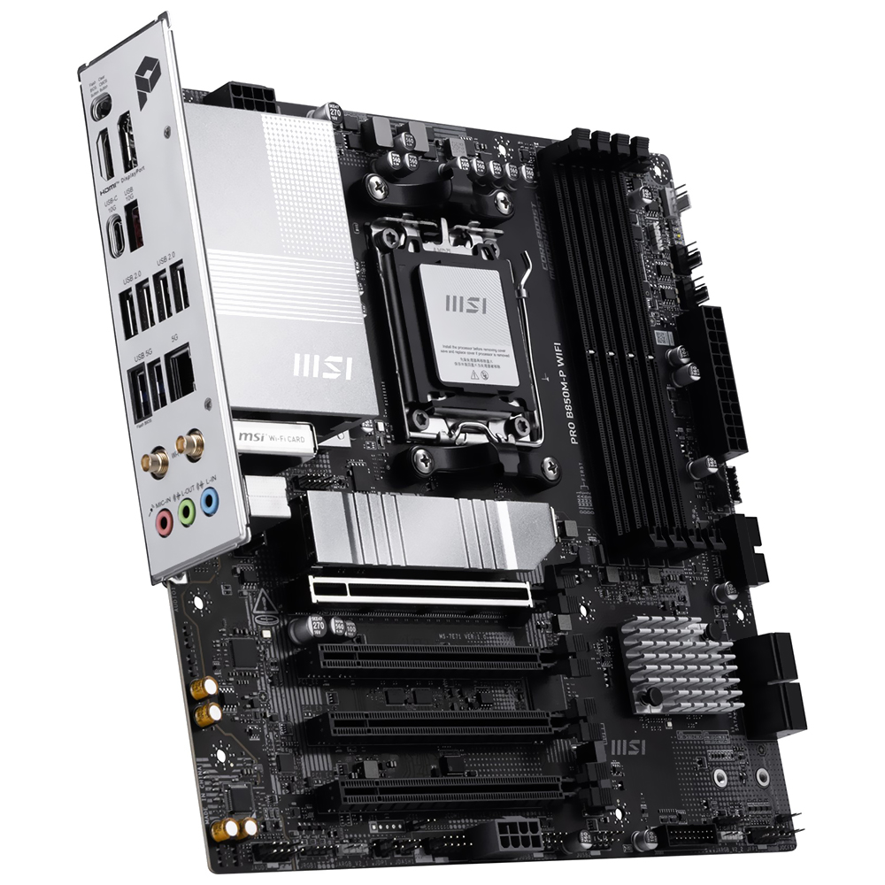 A MSI Pro B850M-P Wi-Fi é uma placa-mãe Micro ATX projetada para quem busca um equilíbrio entre rendimento avançado, conectividade completa e formato compacto. Seu design a torna uma opção ideal para gabinetes reduzidos, sem sacrificar potência ou desempenho. Equipada pelo socket AM5 e chipset B850, é compatível com processadores AMD Ryzen 9000, 8000 e 7000. Seu suporte para memória DDR5 de até 256 GB a 8200 MHz garante fluidez em multitarefas, jogos e produtividade exigente.