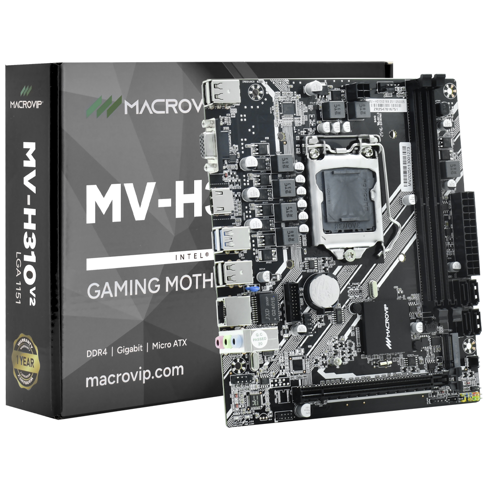 A Macrovip MV-H310V2 é uma placa mãe Micro ATX projetada para computadores de mesa modernos e versáteis. Ela incorpora soquete LGA 1151 e chipset Intel H310C / B250, compatível com processadores Intel de 6ª, 7ª, 8ª e 9ª geração, incluindo Core i7, i5, i3, Pentium e Celeron. Suporta até 64 GB de memória DDR4 em dual channel e armazenamento por meio de 4 portas SATA 3.0 junto a 1 slot M.2 2280. Oferece saída HDMI e VGA, rede Realtek Gigabit e áudio HD de 6 canais.