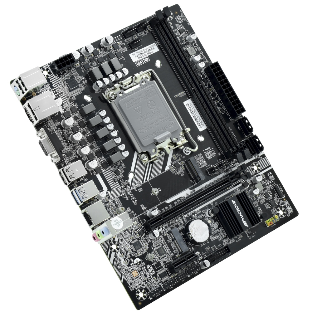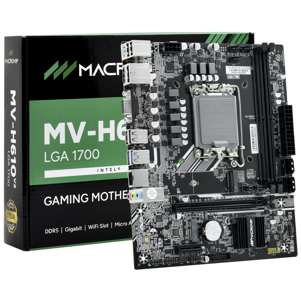 A Macrovip MV-H610V2 é uma placa mãe Micro ATX de alto desempenho com soquete LGA 1700 e chipset Intel H610, projetada para CPUs Intel Core de 12ª, 13ª e 14ª geração. Suporta até 96 GB de memória DDR5 em dual channel a 4800/5200 MHz, oferecendo velocidade e estabilidade para multitarefa avançada. Inclui saídas HDMI, DisplayPort e VGA, armazenamento flexível com M.2 NVMe/SATA e 3 portas SATA, além de PCIe 4.0 x16 para máxima expansão.