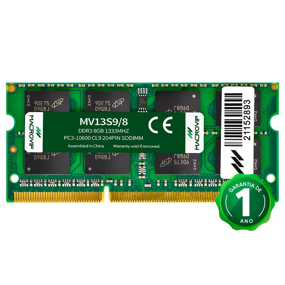 Pode melhorar ainda mais o desempenho do seu notebook com a linha da Macrovip. Possui o modelo SODIMM de 8GB DDR3 a 1333 MHz, uma ótima opção para quem procura uma execução muito mais rápida. Tem uma ampla garantia de até um ano.