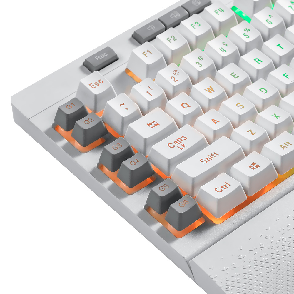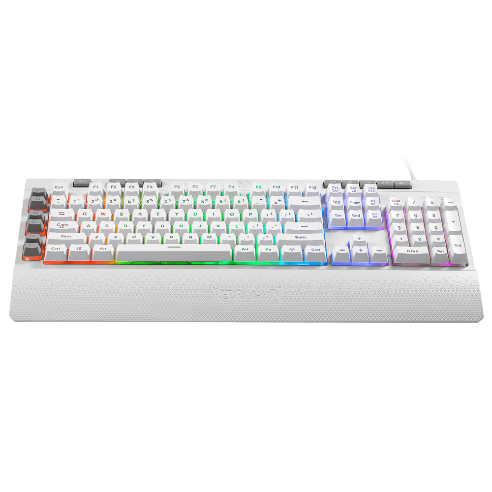 Leve seus jogos ao mais alto nível através do Redragon K512W-RGB-1 Shiva. Esse teclado gamer na cor branca não só se destaca por seu design elegante, mas também combina a resposta suave da membrana e também a resistência do plástico ABS reforçado para uma durabilidade sem igual. Ao mesmo tempo, desfruta da conveniência do descanso de pulso integrado e removível. Por uma conexão USB confiável, o Shiva é o parceiro perfeito para o controle preciso e a imersão total em todos os videogames.